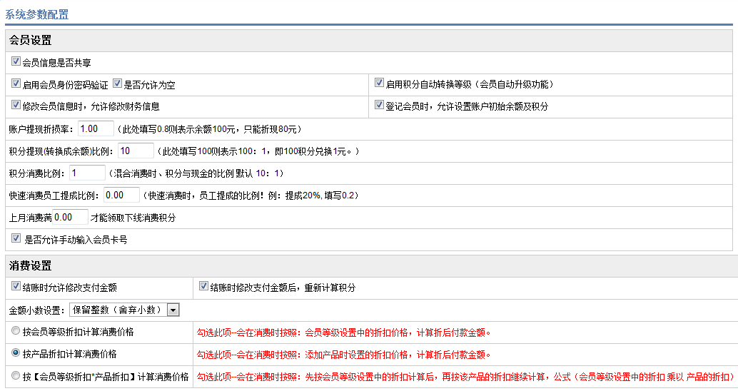 按产品折扣消费价格:勾选此项--会在消费时按照:添加产品时设置的折扣价格,计算折后付款金额。