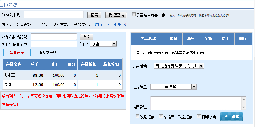 5、在当前页面选择【服务类产品】子菜单,即可以进行计次类产品消费,如下图: