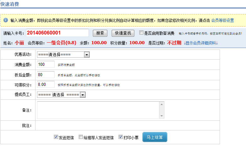 2、输入消费金额,系统将自动按照会员等级计算折扣金额和积分数量。当然也可以直接输入折后金额;