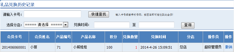 1、输入会员卡号,或者点击“快速查找”按钮,选择会员信息,然后点击“查询”按钮,页面会检索出该会员的所有积分兑换记录;