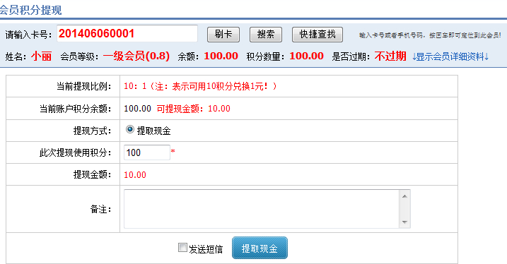 会员积分提现功能一般是针对会员的卡片里有足够的积分,需要拿出来换成现金的情况,在此页面可以完成操作。