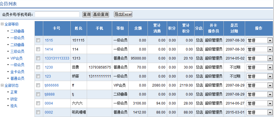 1、通过搜索区输入会员卡号或者会员手机号码可以直接搜索定位到某个会员;