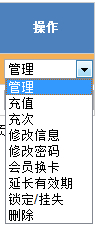 1、每条会员信息列表最后一列都有一个会员管理菜单,点击此下拉菜单可以对会员进行“会员充值、会员充次、修改会员信息、修改密码、换卡、挂失、删除等功能”,如下图: