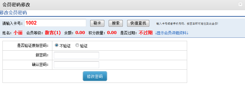 5、点击“修改密码”,可以修改会员卡密码,如下图: