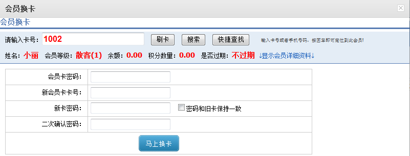 6、点击“会员换卡”,可以对该会员进行换卡操作,如下图: