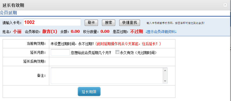 7、点击“延长有效期”,可以延长该会员的会员卡有效期,如下图: