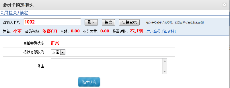 8、点击“挂失|锁定”,可以给会员卡进行挂失操作,如下图: