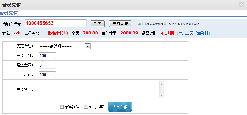 2、点击“充值”,页面调出会员充值页面,可以对会员进行充值操作,如下图: