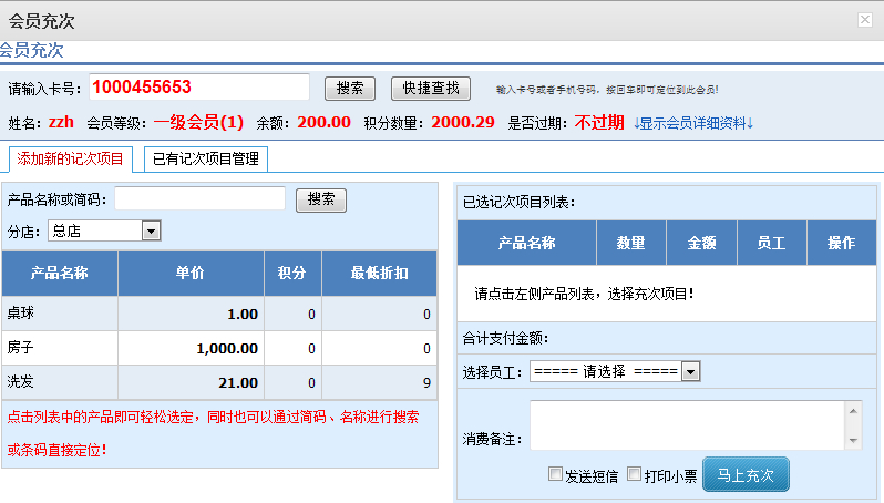 3、点击“充次”,页面调出会员充次页面,可以对会员购买的服务类产品进行充值续次操作,如下图: