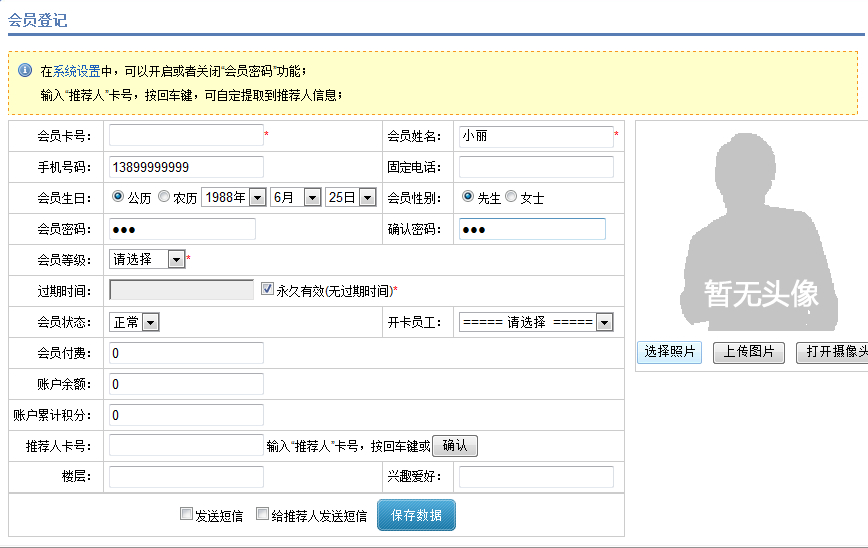 会员头像:保留会员照片存档;此处支持使用摄像头拍照、本地图片上传两种类型。